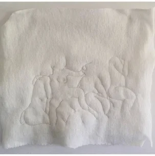 Wandkleden gemaakt van wol in de vorm van mos. Een uitnodiging tot aanraken, knijpen en aaien.
